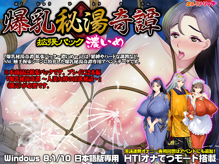 通常のしっとり温泉ロマンAVGに、緊縛調教などのハードなHシーンを追加する拡張パックです。本製品は拡張パックです。プレイには別途「爆乳秘湯奇譚 〜人妻女将の淫欲秘話〜」本編が必要です。※ダウンロード販売専用です。パッケージ版には同梱されます。※シナリオの都合上、排泄系のシーン追加はありません。本編『 爆乳秘湯奇譚 〜人妻女将の淫欲秘話〜 』はこちら!! -